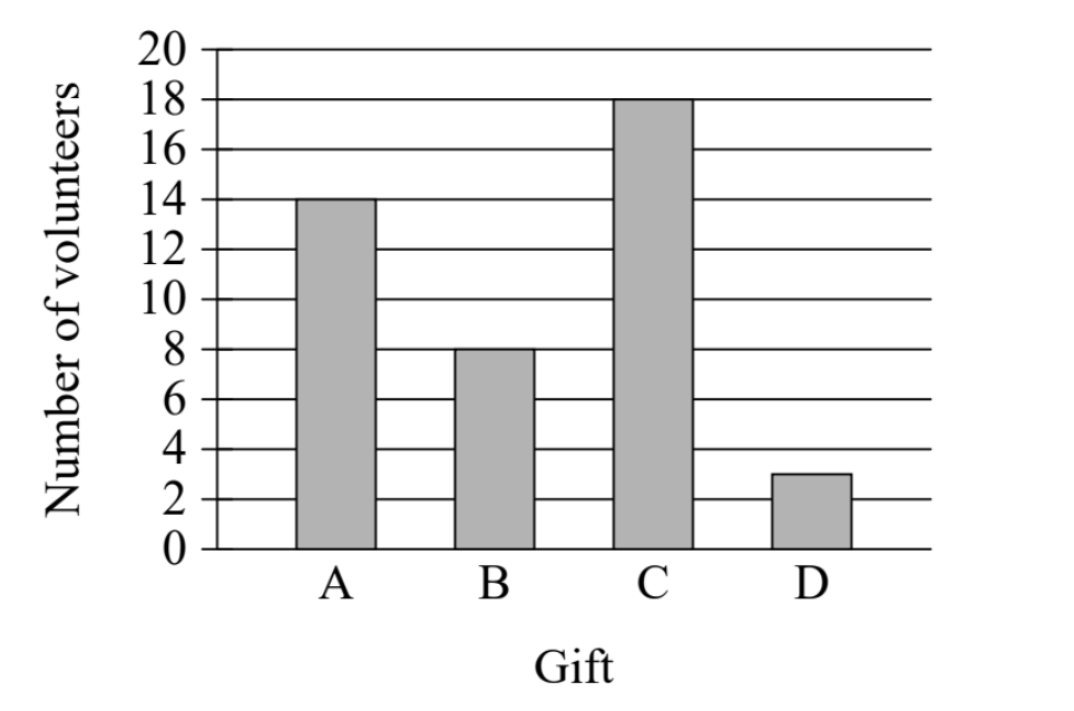 [Bar graph showing Number of volunteers (y-axis, 0-20) vs Gift (x-axis, A, B, C, D). The bars show: A = 14, B = 8, C = 18, D = 3]