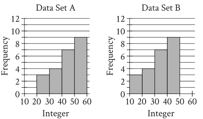 Notice that the histograms have identical shapes, but Data Set A's values range from 20-60 while Data Set B's range from 10-50. The histograms are shifted by 10 units.