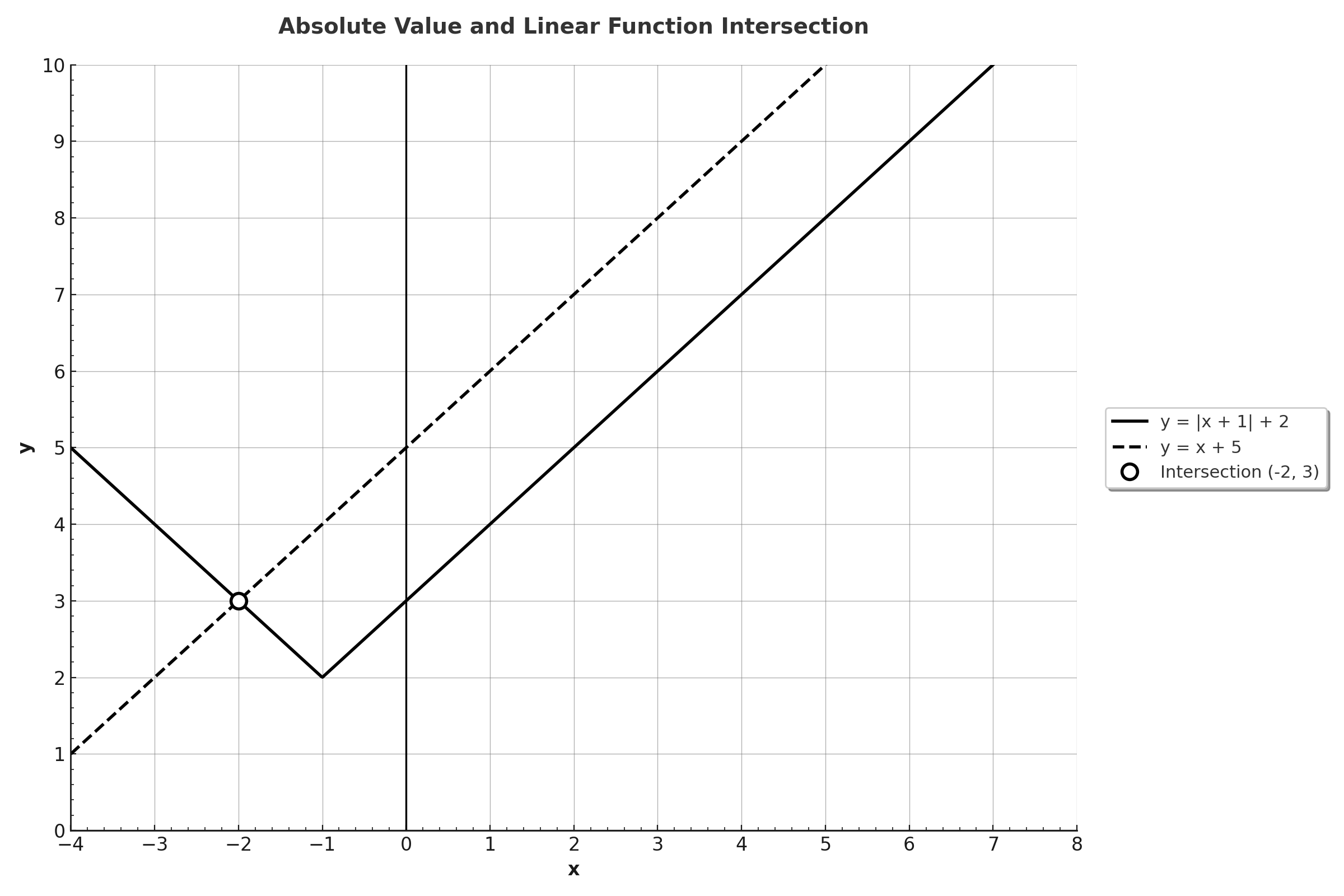 - The solid line represents the absolute value function: \(\mathrm{y = |x + 1| + 2}\) (V-shaped)