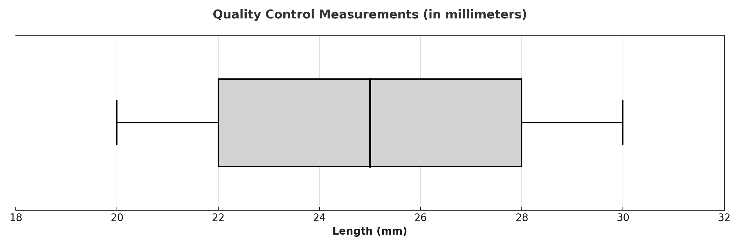 - Q3 (third quartile): The right edge of the gray box = 28 mm