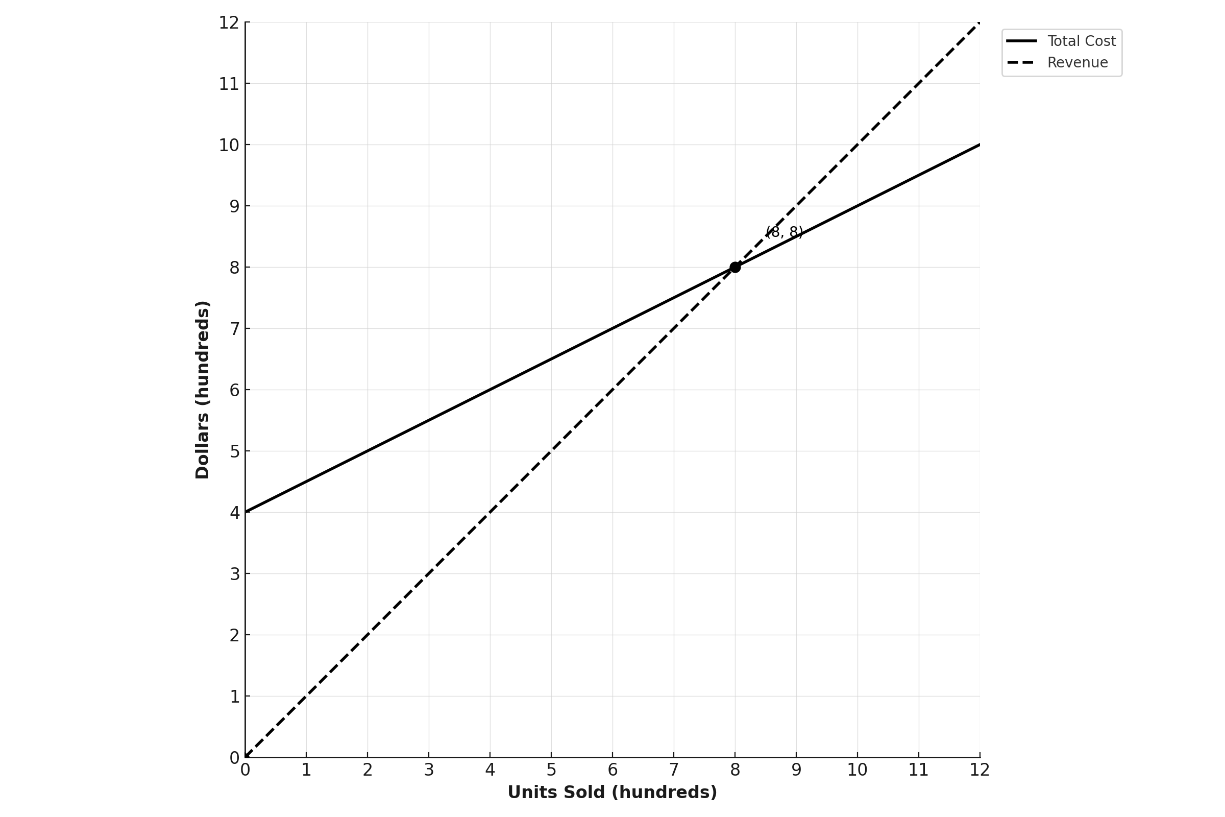 The graph shows the total cost and revenue functions for a small business manufacturing widgets. The total cost includes both fixed costs and variable production costs per unit. At what point (units sold, dollars) does the business break even?