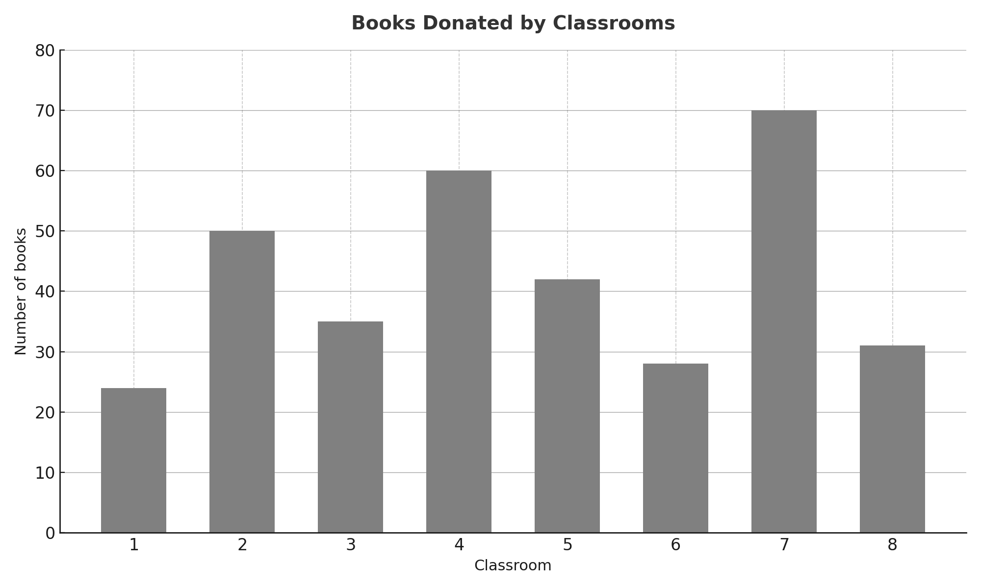 - The bar chart displays the number of books donated by eight classrooms to a library drive.