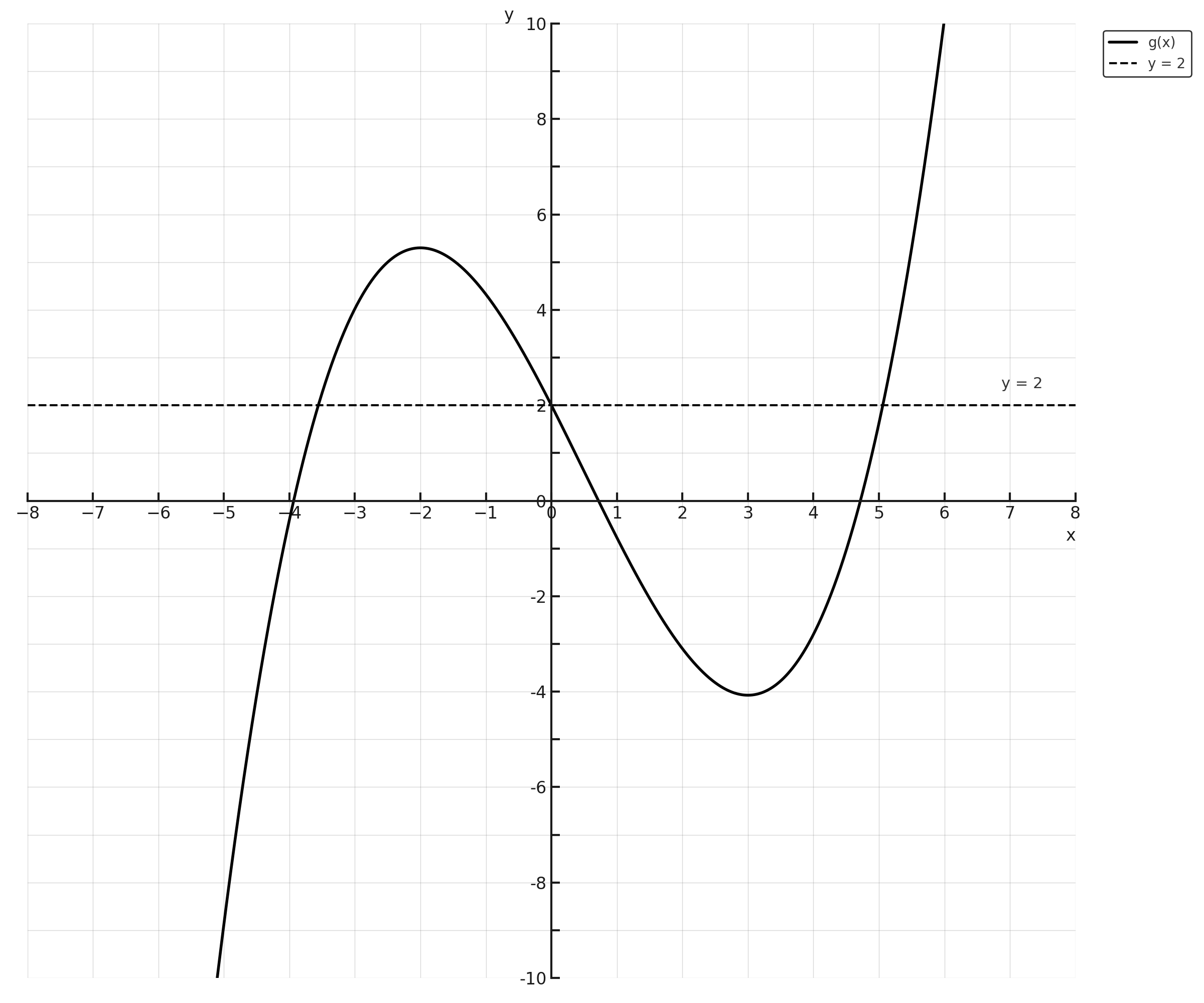 - Graphically, this is the same as counting where the curve \(\mathrm{y = g(x)}\) crosses the horizontal line \(\mathrm{y = 2}\).