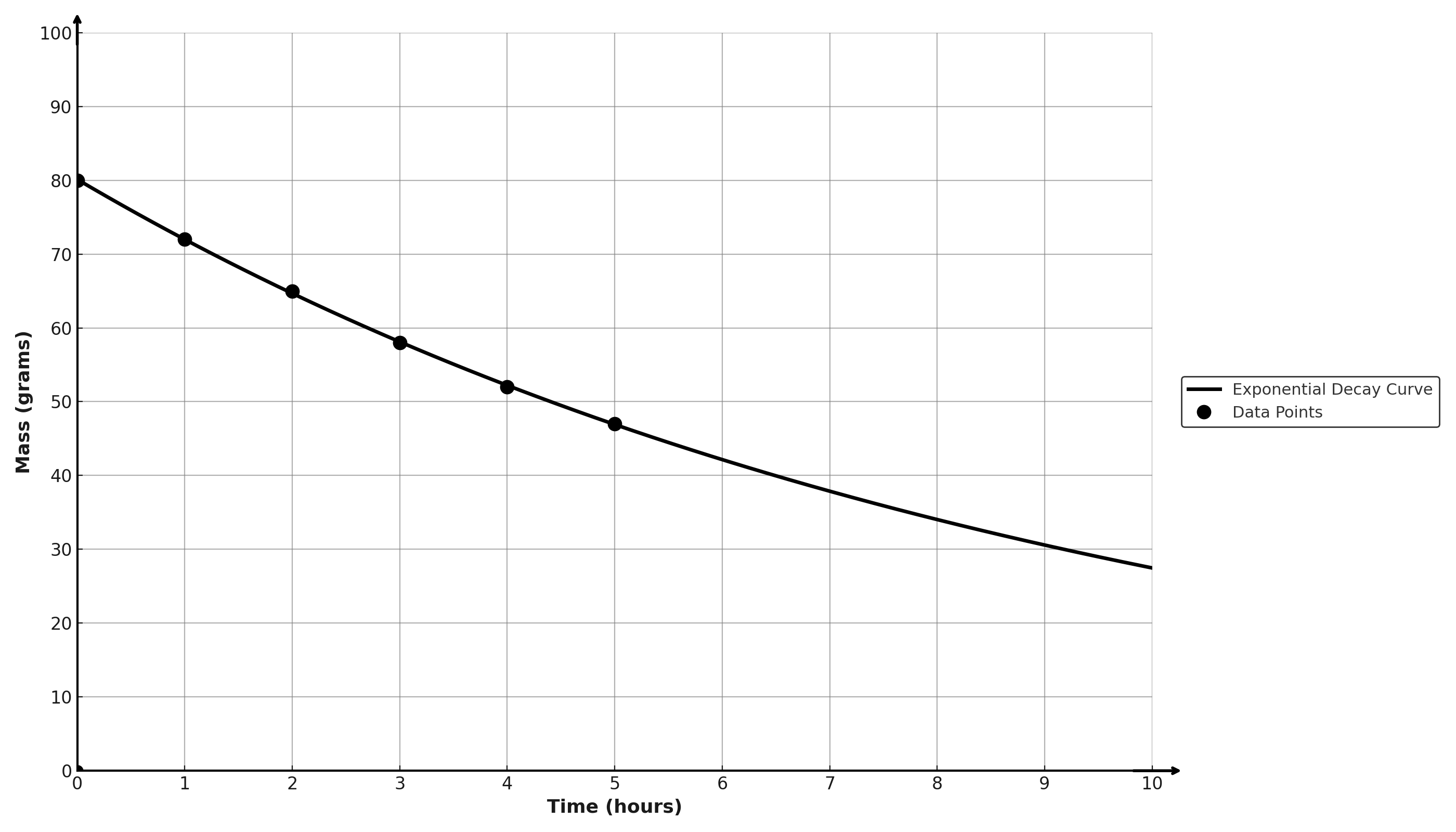 A sample of radioactive material is observed over time, and its mass is recorded at regular intervals. The scatterplot shows...
