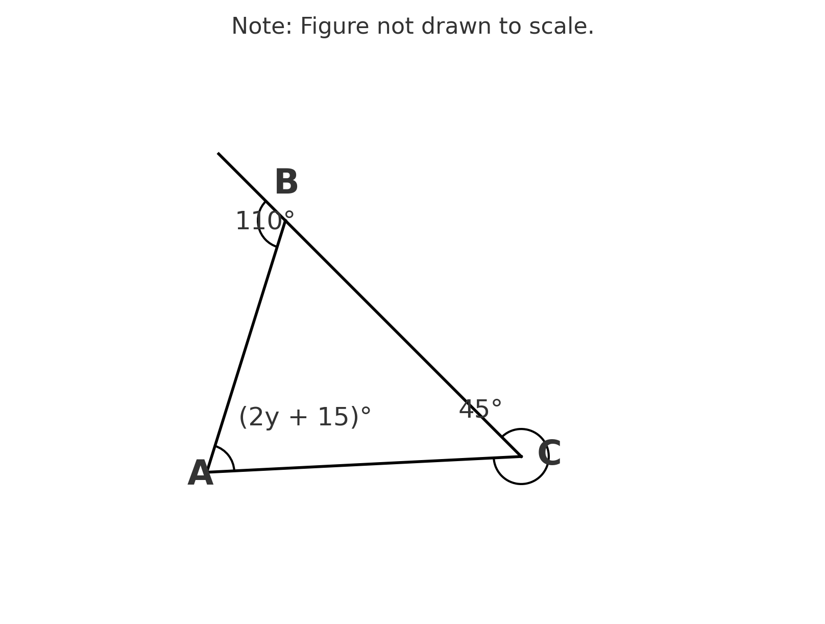 - Triangle ABC has an exterior angle at vertex B measuring \(110°\)