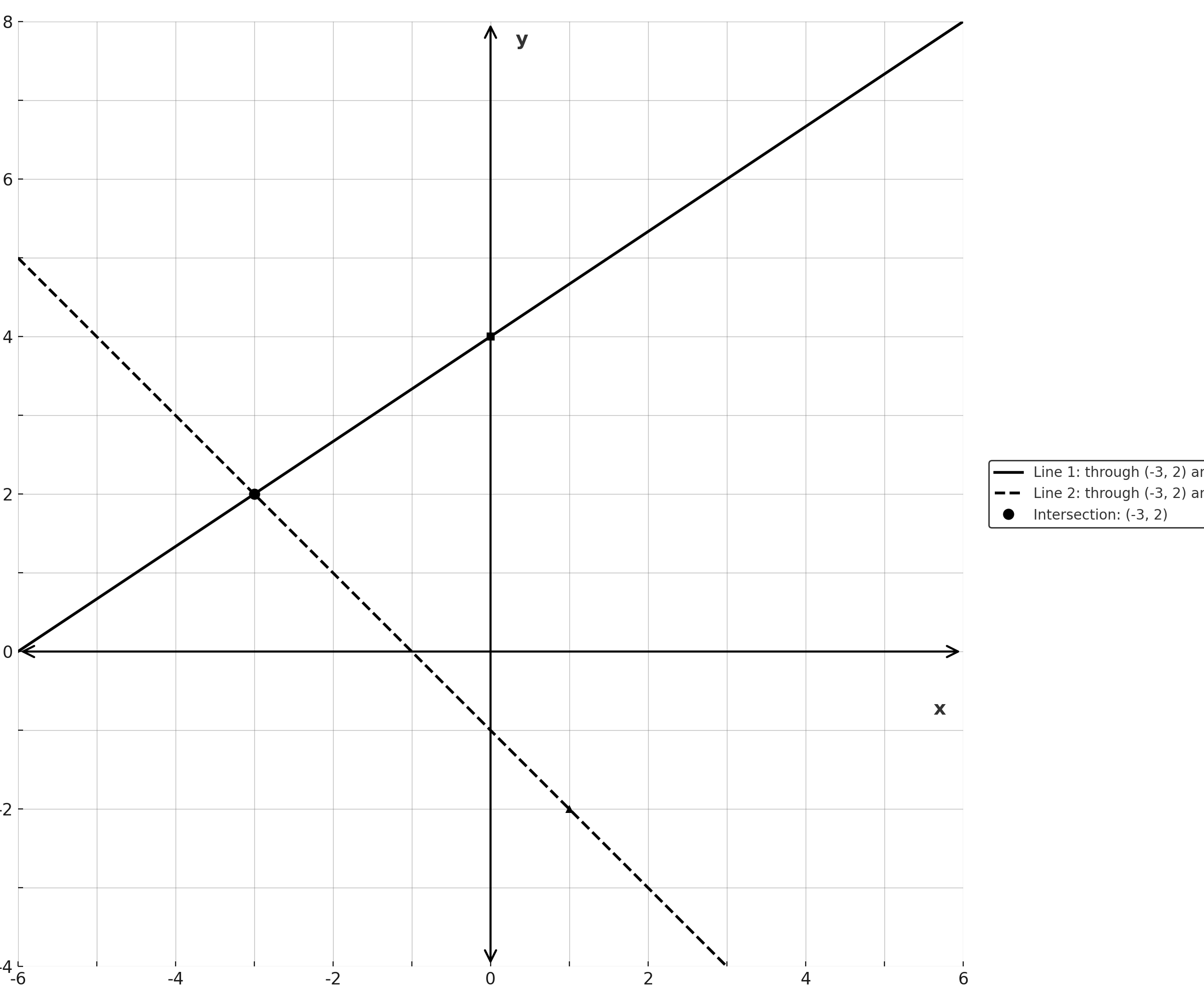 Many students correctly locate the intersection point but then reverse the coordinates, reading it as \(\mathrm{(2, -3)}\) instead of \(\mathrm{(-3, 2)}\). This happens because they don't systematically look down to the x-axis for the x-coordinate and across to the y-axis for the y-coordinate.