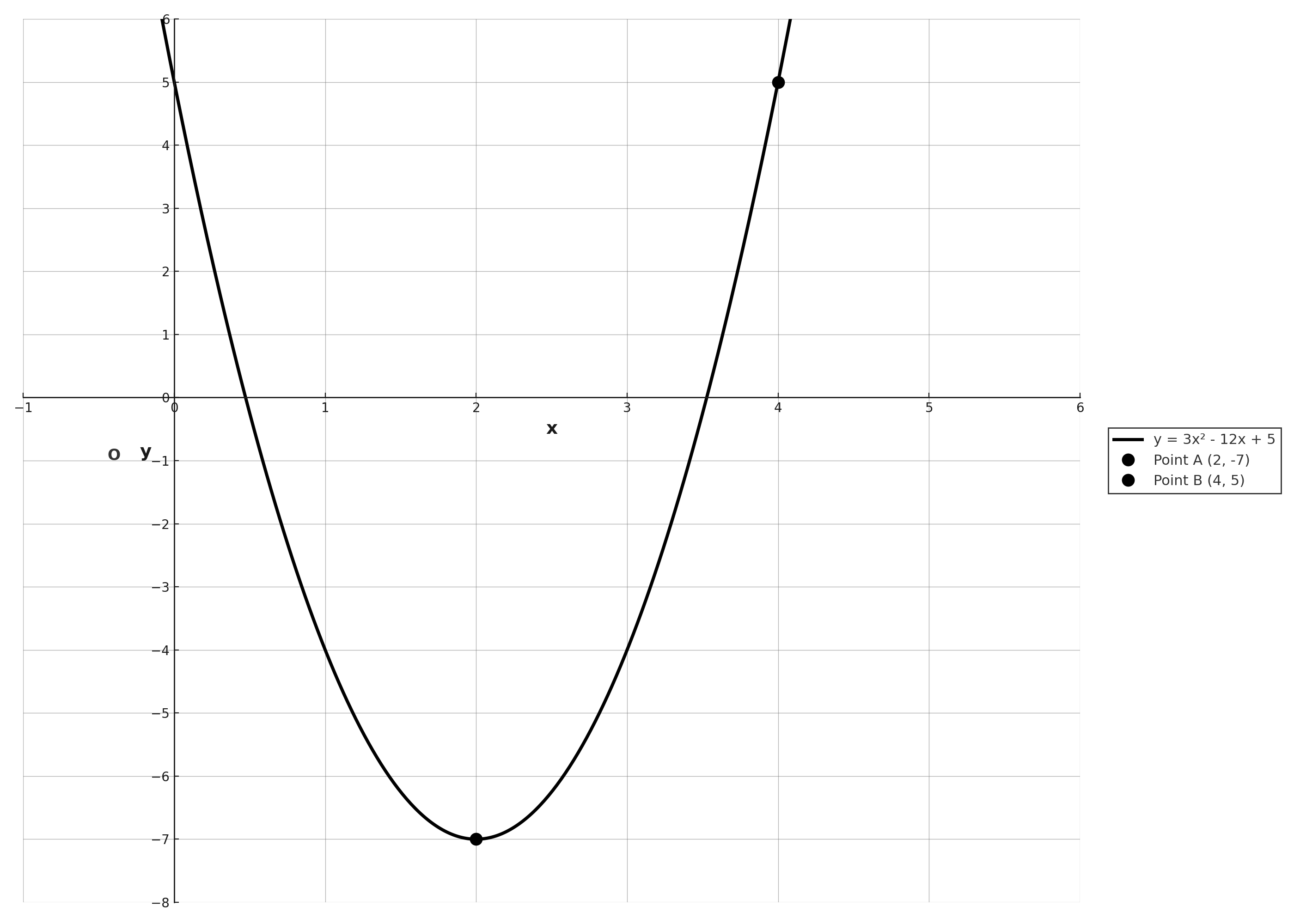 - Point A (2, -7): This is marked as the vertex of the parabola