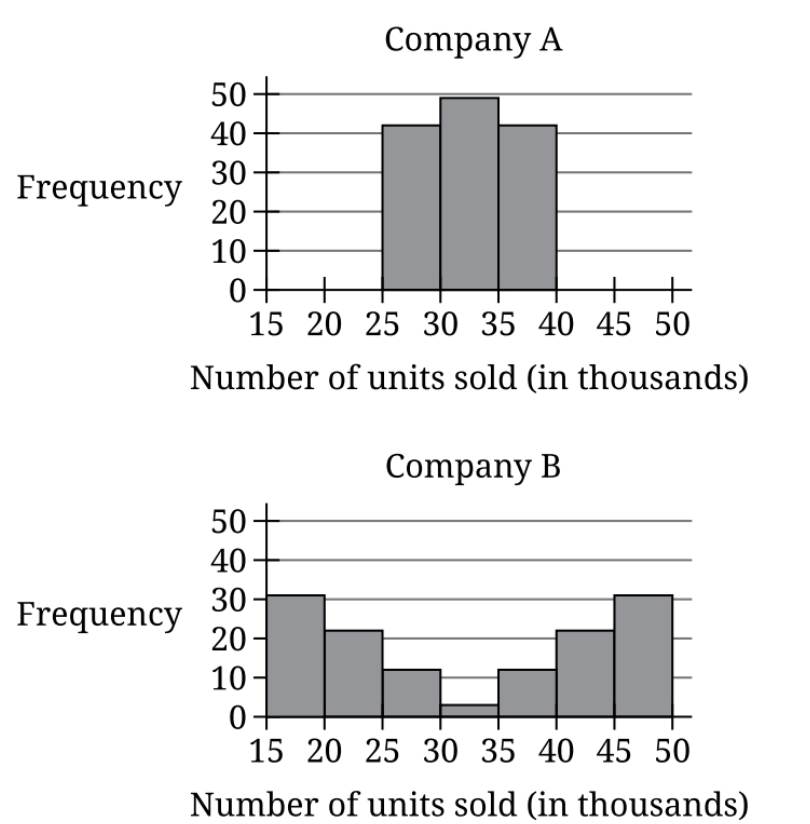 The histograms summarize the distributions of number of units sold, in thousands, for company A and company B.