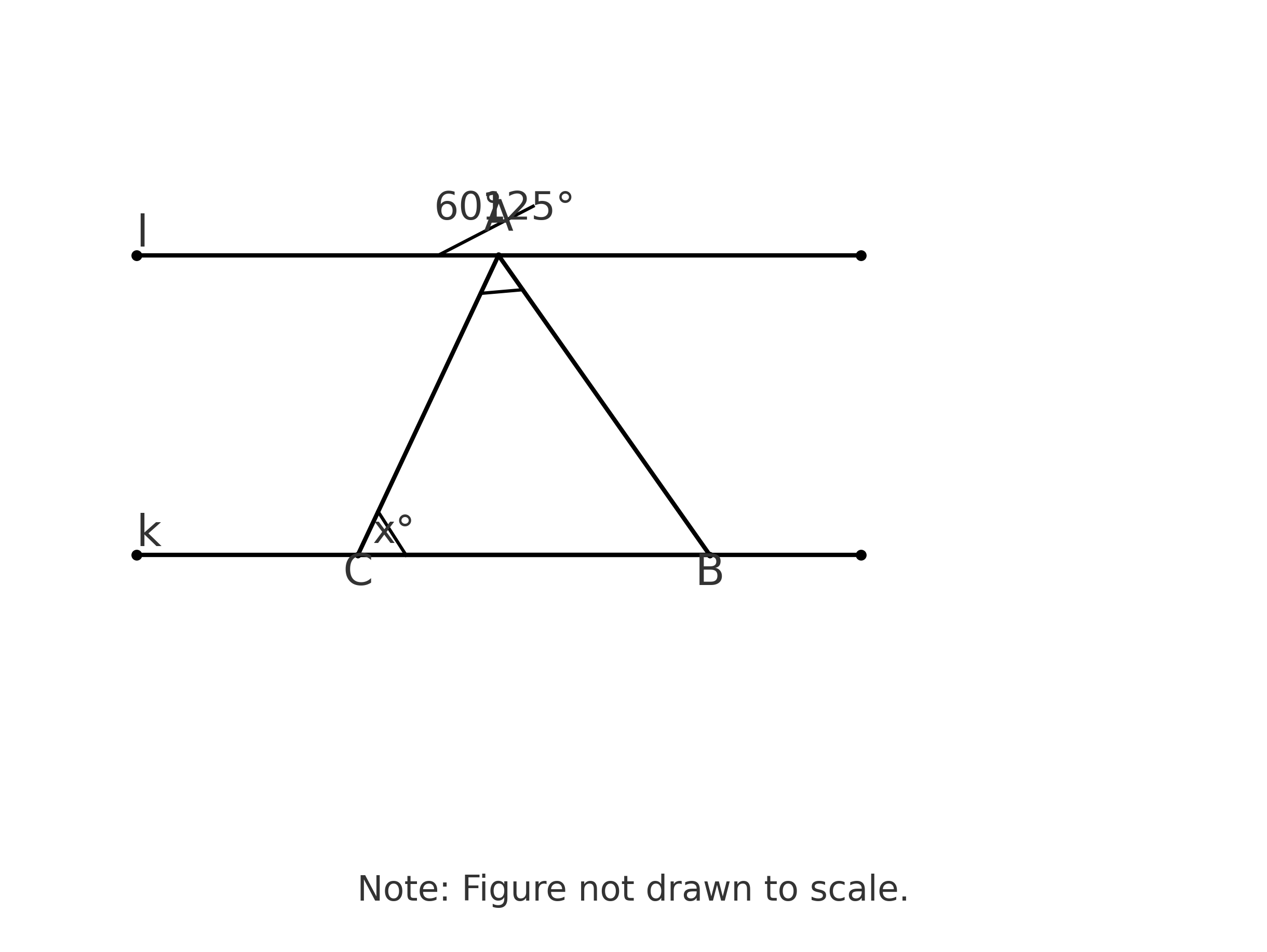 In the figure, line l is parallel to line k. What is the value of \(\mathrm{x}\)?