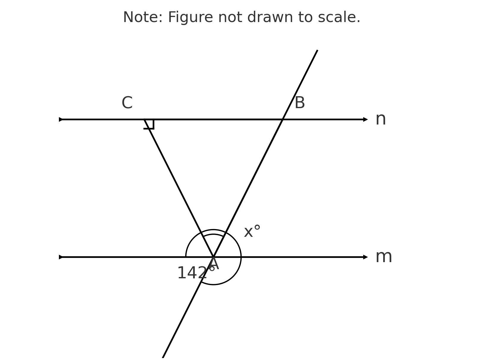 - The angle between line m (going to the left) and line AB (going up to B) = \(180° - 142° = 38°\)