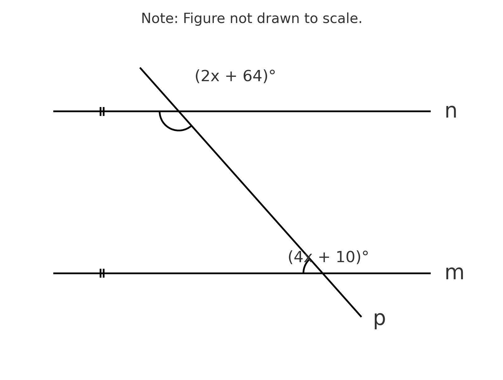 - At the intersection with line m, the interior angle on the lower side of m and to the right of p measures \((4\mathrm{x} + 10)°\). At the intersection with line n, the interior angle on the upper side of n and to the left of p measures \((2\mathrm{x} + 64)°\).
