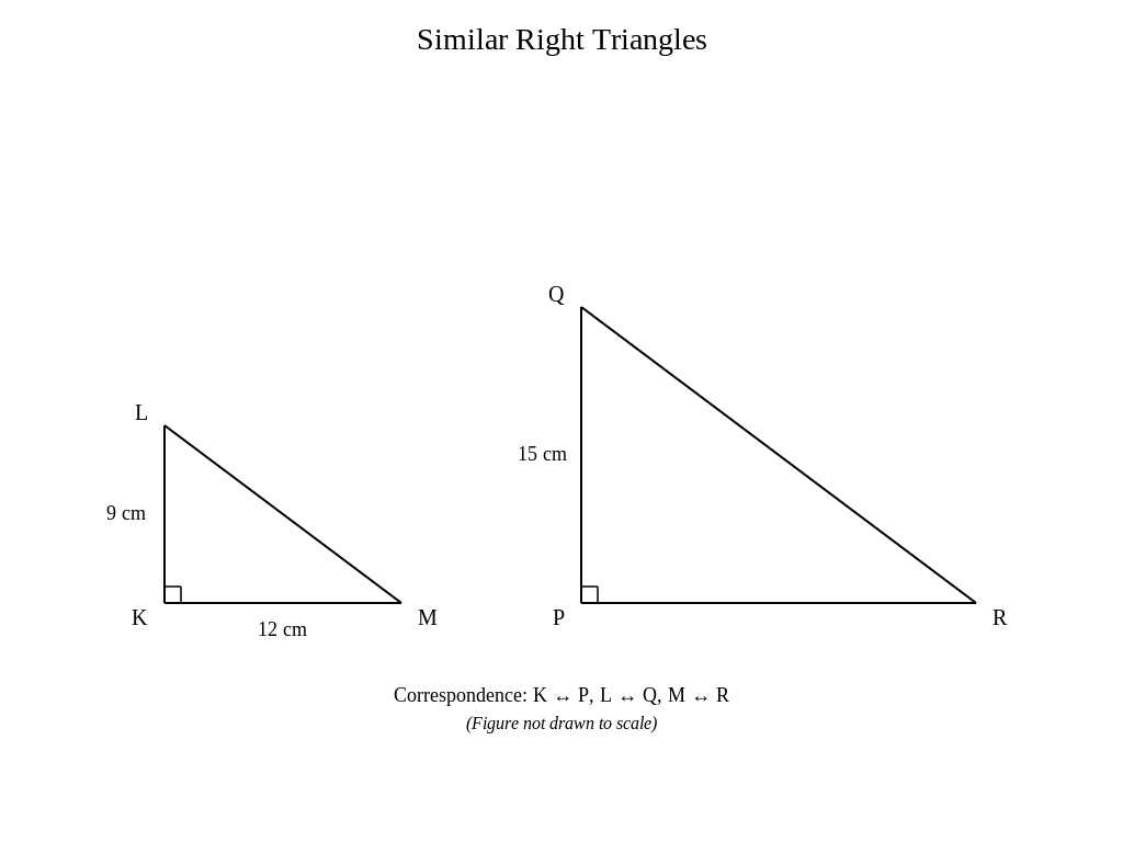 - In triangle \(\mathrm{KLM}\), \(\mathrm{KL = 9}\) centimeters and \(\mathrm{LM = 12}\) centimeters; in triangle \(\mathrm{PQR}\), \(\mathrm{PQ = 15}\) centimeters.