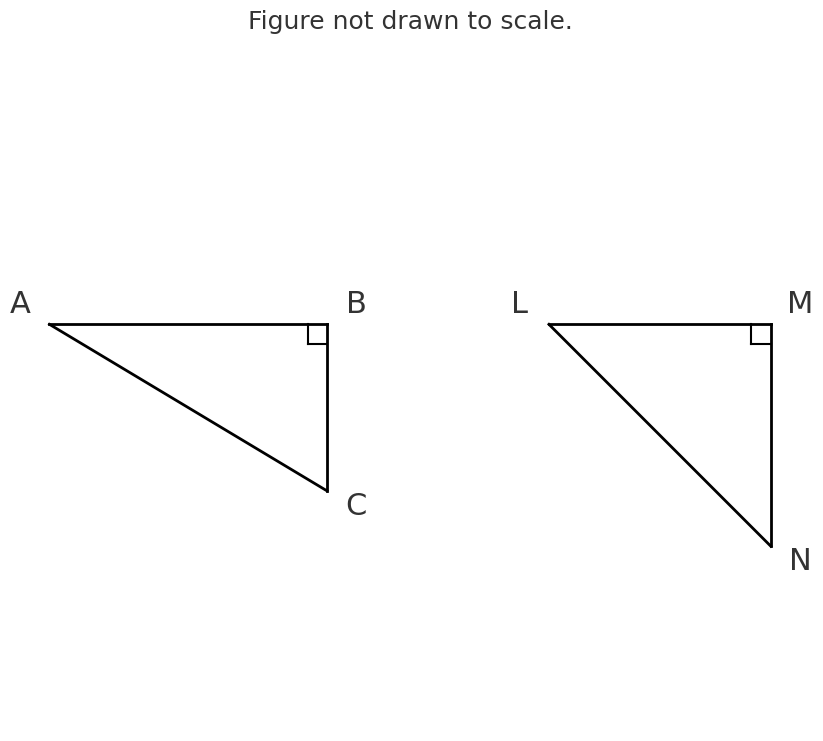 Right triangles ABC and LMN are similar. Vertex A corresponds to vertex L, and both triangles have right angles at...