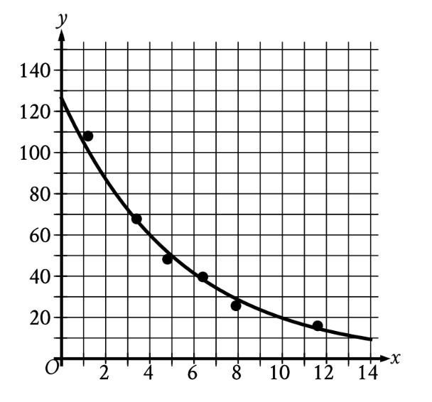 The scatterplot shows the relationship between two variables, \(\mathrm{x}\) and \(\mathrm{y}\). An equation for the exponential model shown can be written as \(\mathrm{y = a(b)^x}\), where \(\mathrm{a}\) and \(\mathrm{b}\) are positive constants. Which of the following is closest to the value of \(\mathrm{b}\)?