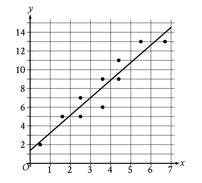 - Point 2: When x = 7, the line passes through approximately y = 15
