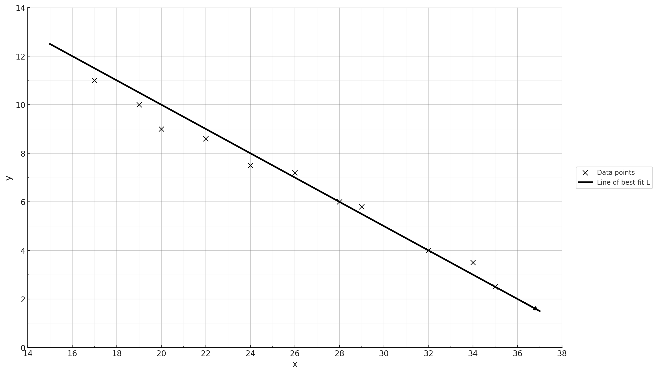 Students may misread the points on the line of best fit, perhaps identifying points like \(\mathrm{(15, 11)}\) and \(\mathrm{(35, 3)}\) instead of the more accurate \(\mathrm{(16, 12)}\) and \(\mathrm{(36, 2)}\). This would give: