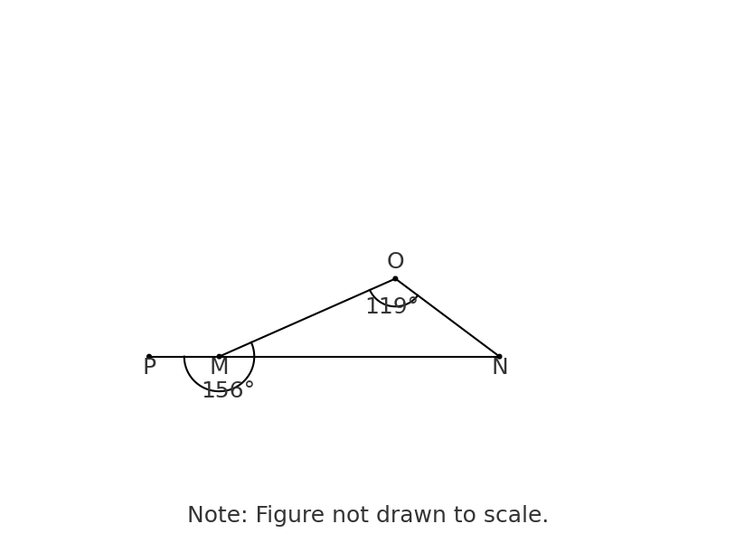 In triangle MNO, MN is extended to point P. The measure of \(\angle\mathrm{MON}\) is \(119°\), and the measure of \(\angle\mathrm{OMP}\) is \(156°\). What is the measure of \(\angle\mathrm{OMN}\)?