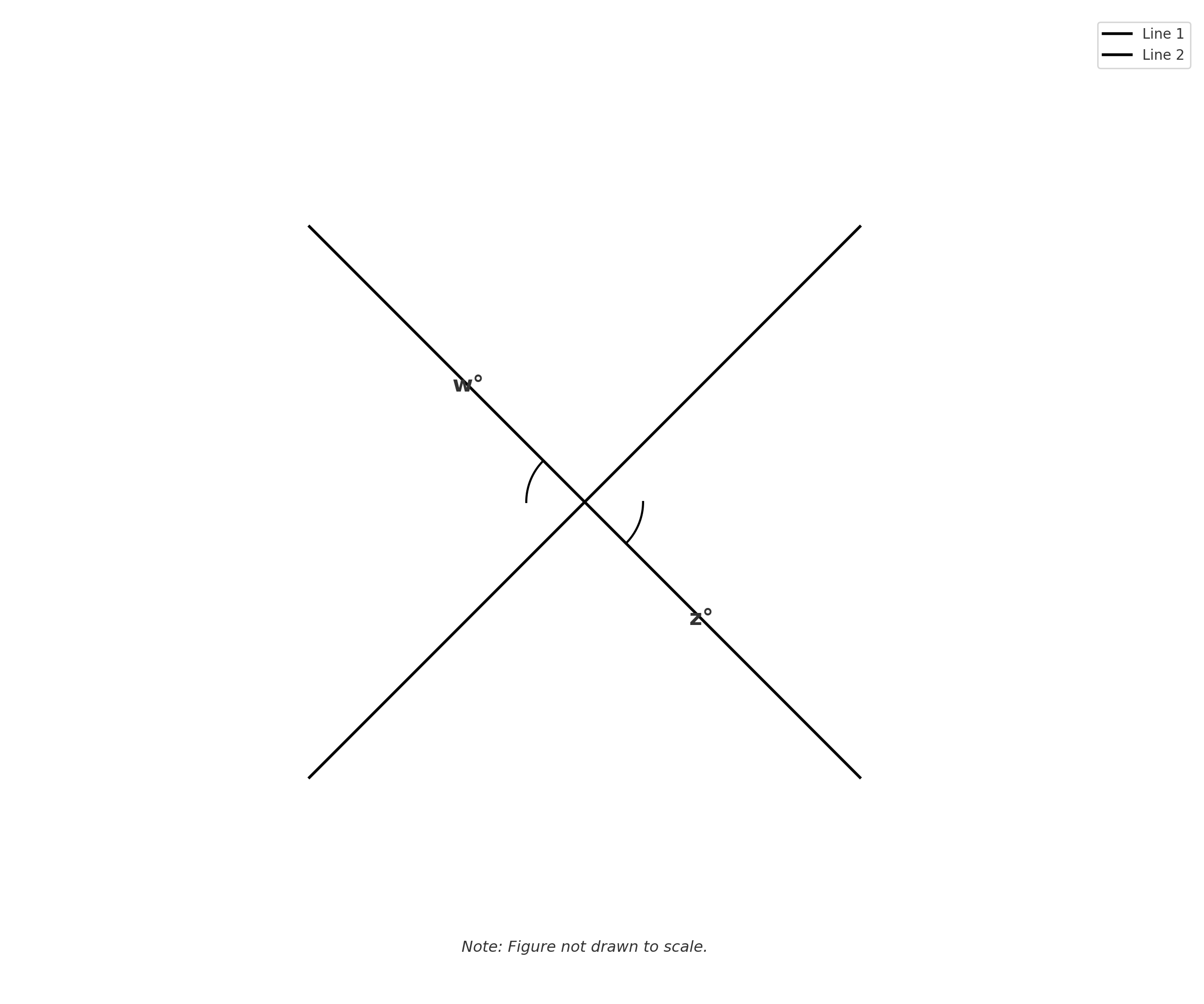 Students may not carefully trace which angles in the diagram are labeled w and z. If they assume w and z are adjacent angles instead of opposite angles, they'll apply the wrong relationship. Even with correct knowledge of both vertical angles (equal) and adjacent angles (supplementary), misidentifying the actual positions leads to using the supplementary relationship.