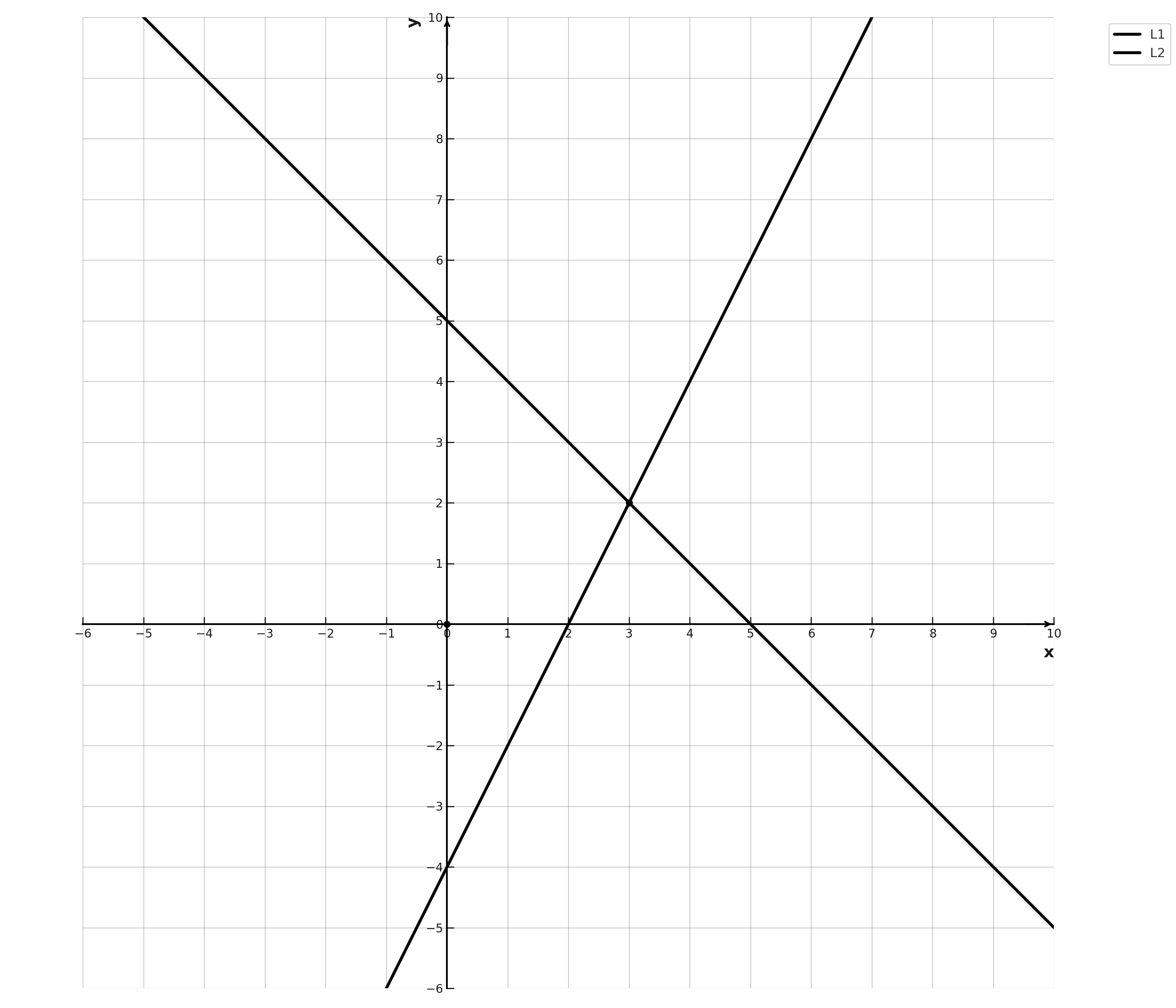 The problem asks for the solution to a system of linear equations. The key insight here is that when two lines are graphed on the same coordinate plane, their solution is the point where they intersect - the \(\mathrm{(x, y)}\) coordinates that satisfy both equations simultaneously.