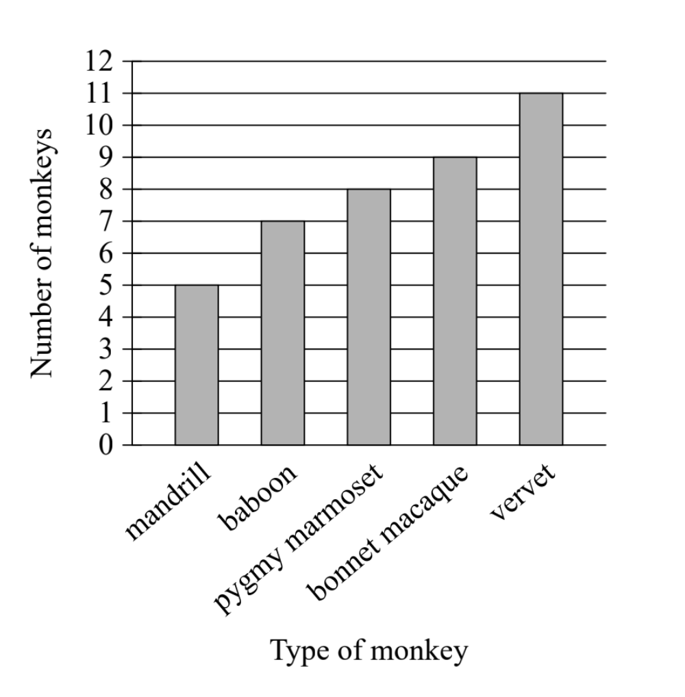 [Bar graph showing Number of monkeys (y-axis, 0-12) vs Type of monkey (x-axis: mandrill, baboon, pygmy marmoset, bonnet macaque, vervet). The bars show: mandrill = 5, baboon = 7, pygmy marmoset = 8, bonnet macaque = 9, vervet = 11]