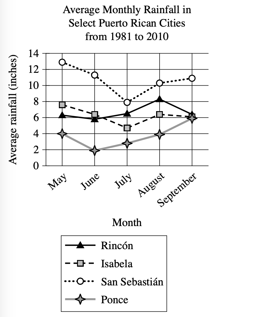 A student is presenting average monthly rainfall totals in various Puerto Rican cities for a science class. During the presentation, the student notes that in September ________