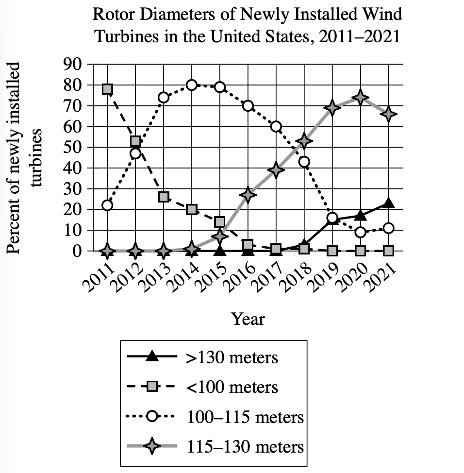 Visual Type & Title: Line graph - Rotor Diameters of Newly Installed Wind Turbines in the United States, 2011-2021