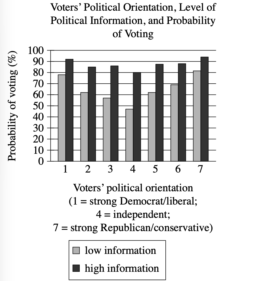 - Looking at the graph, at every single political orientation (positions 1-7), the high-information voters (black bars) have higher voting probabilities than low-information voters (gray bars)