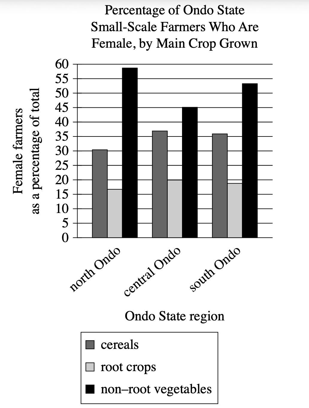- Text-Visual Synthesis: The passage describes the qualitative finding that female farmers are 'especially prominent' and even form 'the majority' in certain crop cultivation, while the graph provides the quantitative evidence showing exactly where this occurs—specifically with non-root vegetables in north and south Ondo, where female participation exceeds 50%.