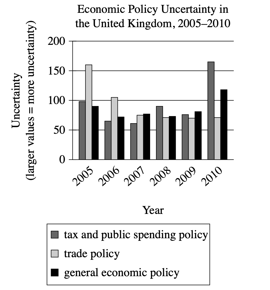 What It Shows: Three types of uncertainty (Tax/public spending, Trade policy, General economic) measured annually from 2005-2010. Higher values indicate more uncertainty.