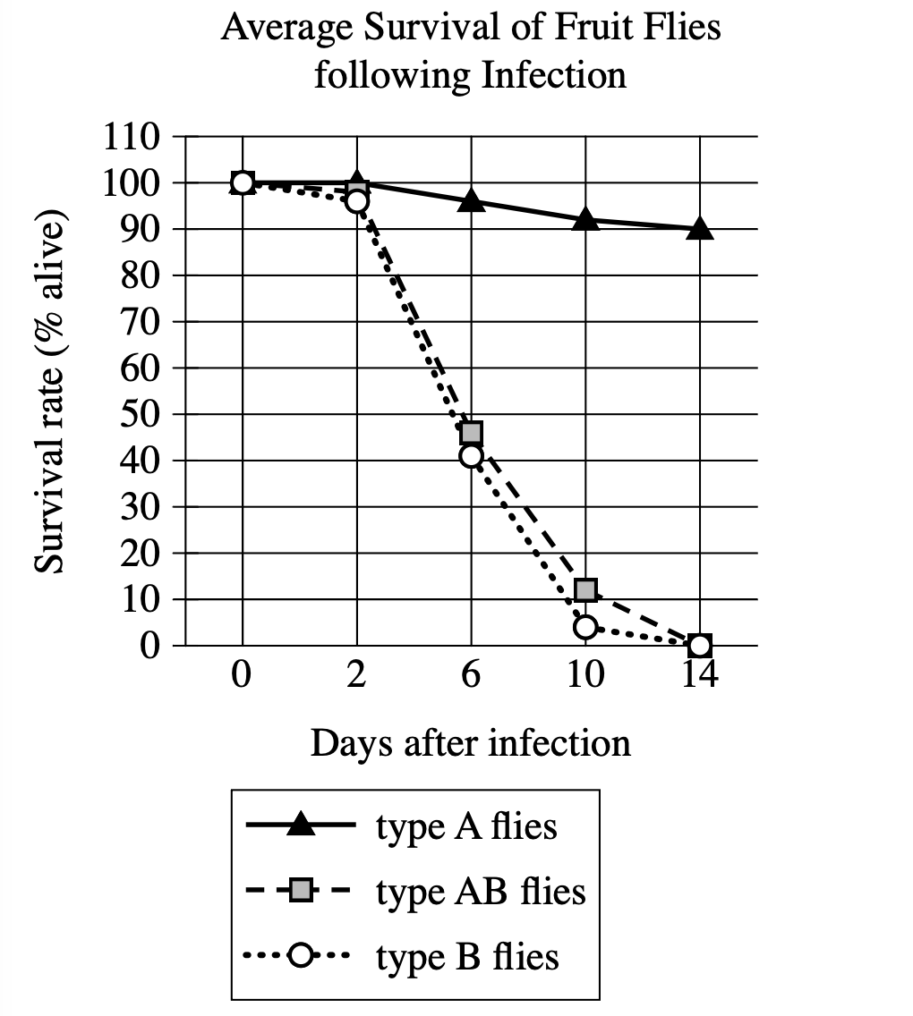 - Type AB flies (neither): rapid decline 100%→near 0% by day 14 (poor survival)