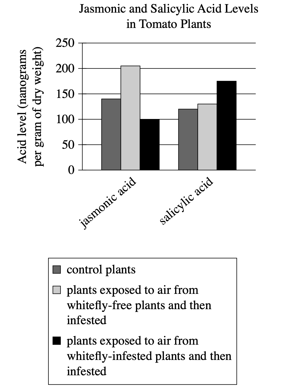 - "Less jasmonic acid and more salicylic acid than did control plants" matches whitefly-infested air group (~100 vs ~140 jasmonic; ~175 vs ~120 salicylic)