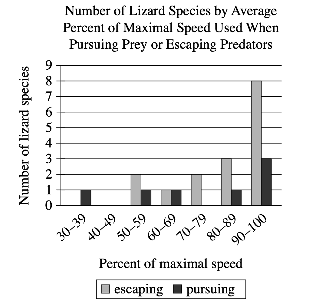 Visual Type & Title: Bar chart - "Number of Lizard Species by Average Percent of Maximal Speed Used When Pursuing Prey or Escaping Predators"