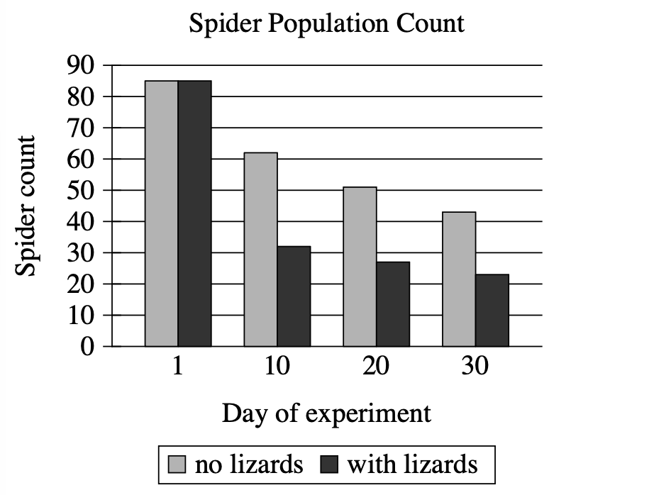 | "To investigate the effect of lizard predation on spider populations, a student in a biology class placed spiders in two enclosures, one with lizards and one without, and tracked the number of spiders in the enclosures for 30 days." |